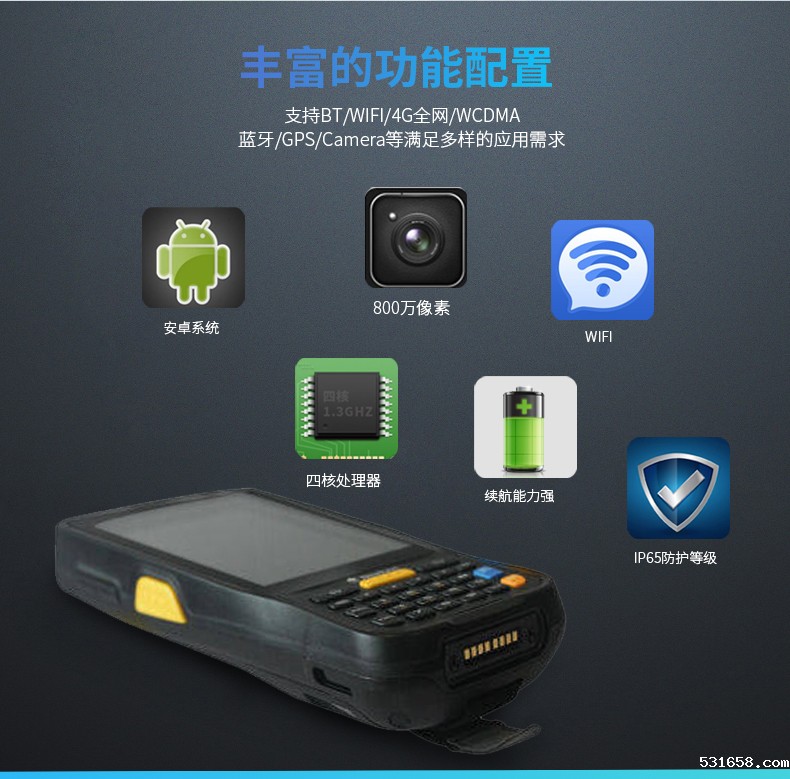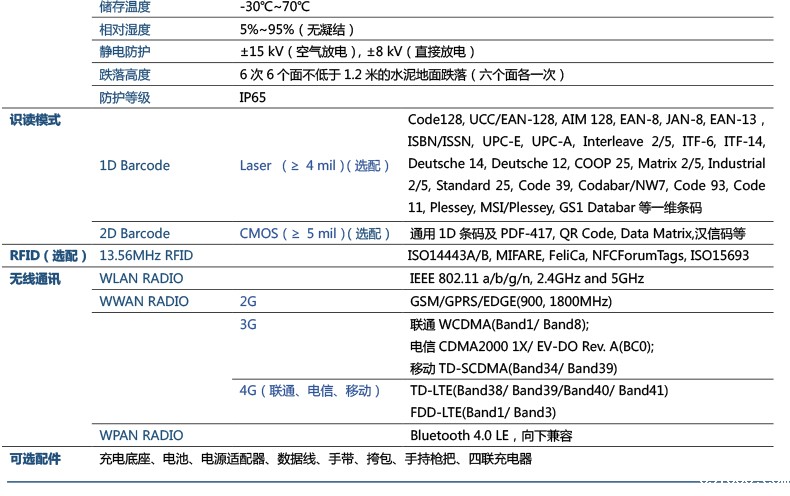 支持1D/2D/BT/WiFi /4G*网通/3G*网通/GPS/ Camera/NFC,满足多样应用需求。